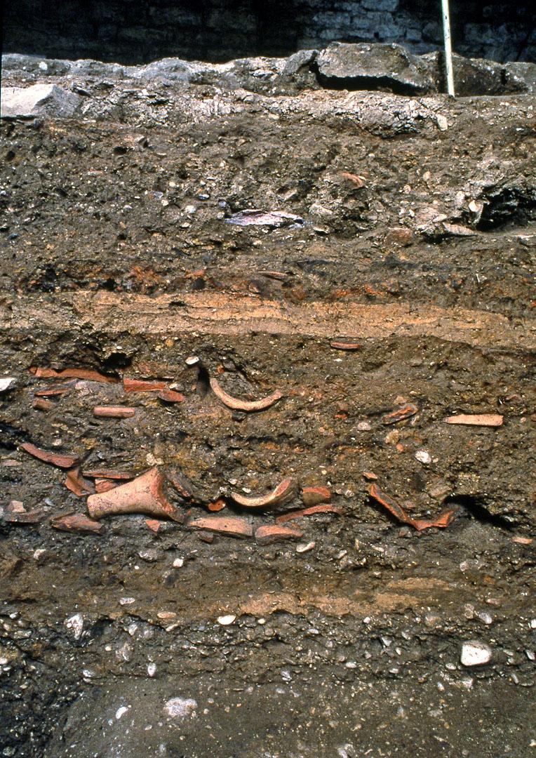 La stratigraphie traversée par le sondage montre une succession d'au moins trois sols et des couches de démolition en pisé ou torchis. Elle offre un bon résumé de l'évolution du secteur entre la fin du Ier siècle avant notre ère et la fin du Ier siècle de notre ère et atteste la présence de maisons en terre et bois.