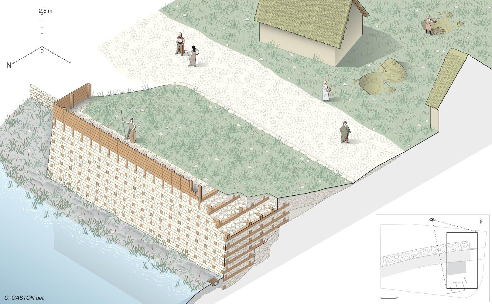 Ils formaient un mur grossièrement parementé d'une hauteur de 2 m au moins. Ce mur de berge a pu être suivi sur une longueur de 80 m.
