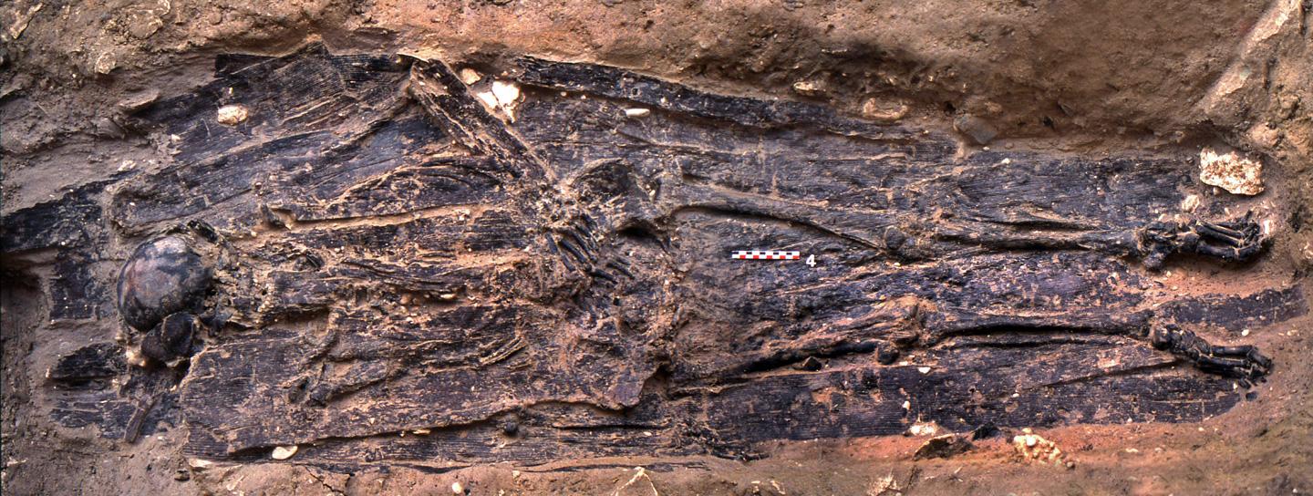 La fouille, réalisée dans ces accumulations, a révélé la présence de vingt-six sépultures disposées au pied du murus gallicus, aux abords de l'ouverture pratiquée dans l'enceinte. Elles sont surprenantes à plus d'un titre. À l'époque gauloise, la crémation constitue le mode funéraire dominant et les inhumations sont minoritaires. De plus, elles sont ici implantées dans un secteur des plus défavorables, en zone inondable. Certains corps sont recouverts par, ou disposés sur, des bardeaux de chêne. Adultes et enfants sont représentés à part égale et l'on peut noter que, contrairement à d'autres sites où les squelettes des enfants morts prématurés ou en très bas âge sont trouvés dans des dépotoirs, ils ont ici bénéficié d'un traitement similaire à celui des adultes. Le mobilier associé à ces tombes est très rare, mais nous laisse supposer une durée d'utilisation de l'ordre d'une trentaine d'années, entre la construction de l'enceinte et la conquête romaine.