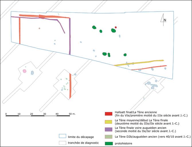 La présente opération a permis la mise au jour d'un ensemble de 28 structures archéologiques correspondant à des fossés, fosses, silos et trous de poteau. La faible quantité du mobilier céramique est proportionnelle au faible nombre de faits découverts. Seuls 11 d'entre eux ont révélé des fragments de céramique. La majorité des structures est datée de la période protohistorique. Les premiers indices d'occupation apparaissent dès le Hallstatt final-La Tène ancienne avec une fosse. Au cours de La Tène moyenne-début de La Tène finale, un petit réseau de fossés se met en place, suivant une orientation est-ouest. À partir de la seconde moitié du IIe-Ier siècle avant J.-C. (La Tène finale-Augustéen ancien), un nouveau réseau de fossés, orienté nord-sud/est-ouest, apparaît. Il dessine un éventuel enclos quadrangulaire, auquel est associée une structure de stockage de type silo (SI 1003). Six autres silos ont été mis au jour, mais leur pauvreté en mobilier céramique ne permet pas de leur donner une datation précise dans la Protohistoire. Lors du diagnostic, un silo (SI 10007, TR 100) situé au sud de la zone fouillée a livré du mobilier attribuable au Gallo-Romain précoce. Il semblerait donc envisageable de considérer que les structures de stockage, issues de la fouille, se rattachent à la période d'occupation de la transition La Tène finale/Gallo-Romain précoce.