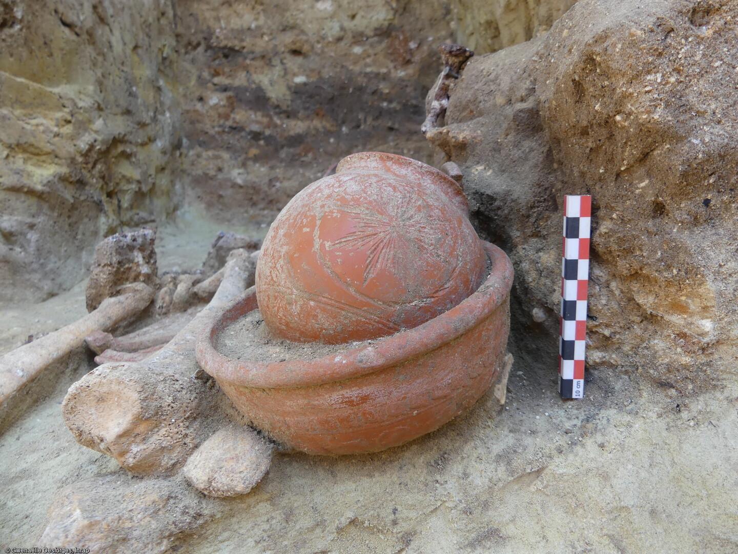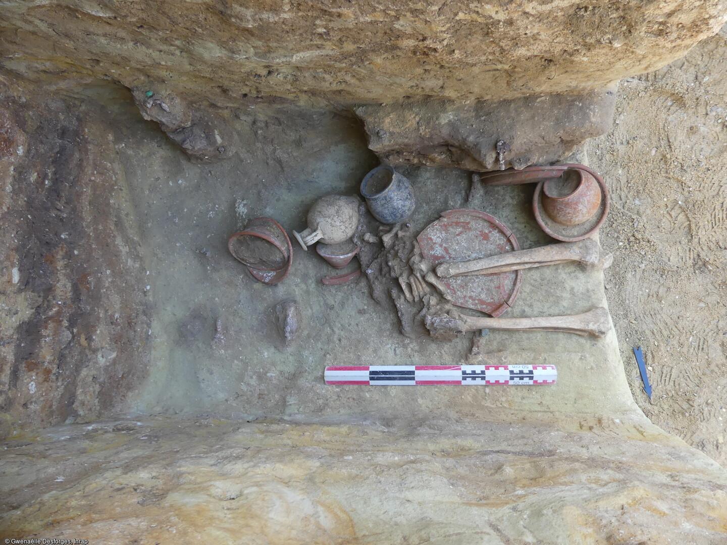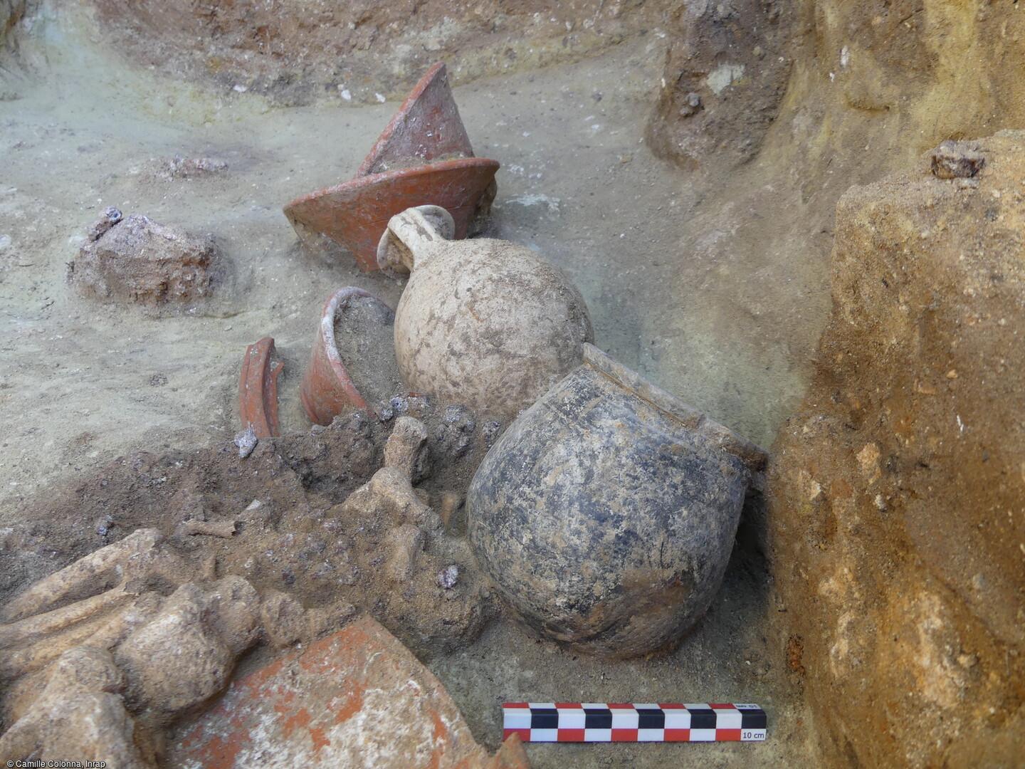 La fouille a permis la mise au jour de 50 sépultures à inhumations, globalement datées du IIe siècle. Leur densité est assez importante et de nombreux recoupements ont pu être observés. Comme couramment observé à l’Antiquité, aucune organisation ou orientation ne semble prédominante, et le creusement des fosses sépulcrales, parfois de très grandes dimensions, tant en longueur qu’en profondeur, s’avère tout aussi fréquemment étroit et arasé.