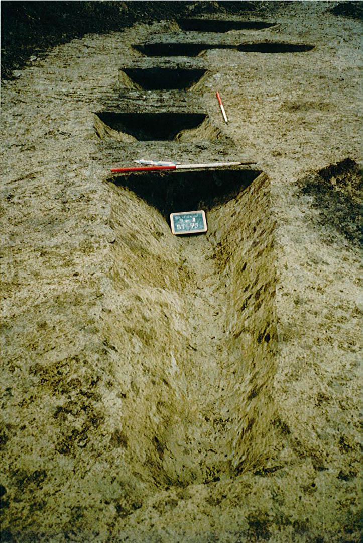 Le comblement du fossé se détache nettement du sable limoneux blanc en place sur les flancs de la structure.