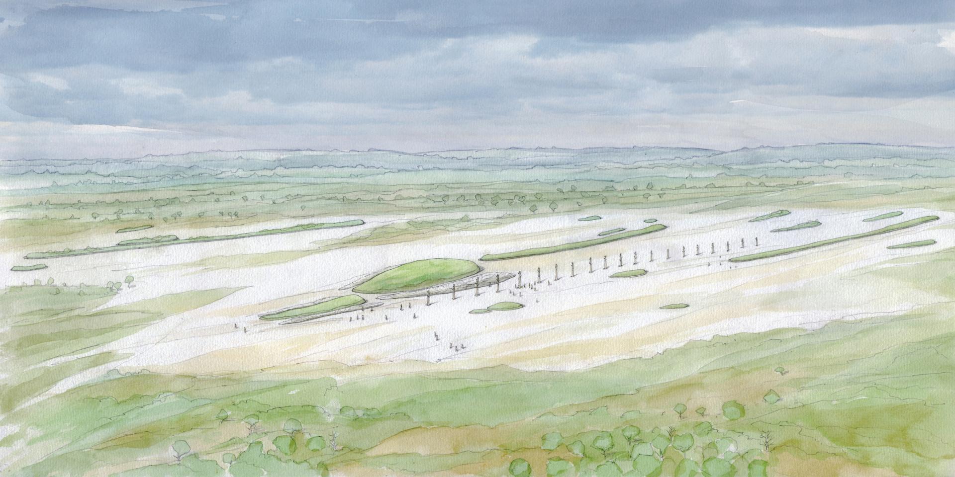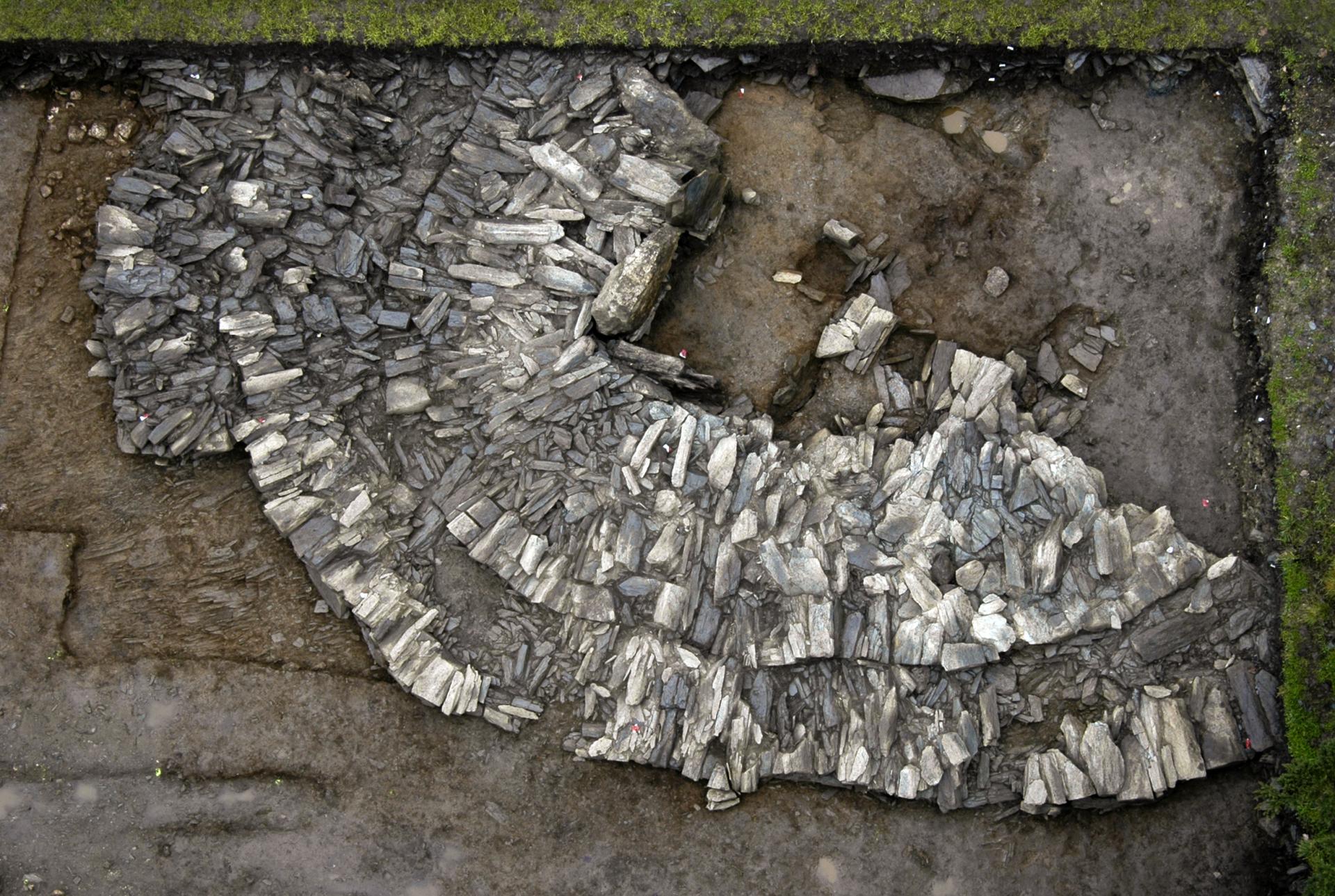 Vue panoramique de la fouille montrant au premier plan les monuments funéraires 3, 4 et 8 et au second plan les monuments funéraires 1, 2, 25 et 5 de la nécropole du Néolithique moyen à Fleury-sur-Orne (Calvados), 2014.