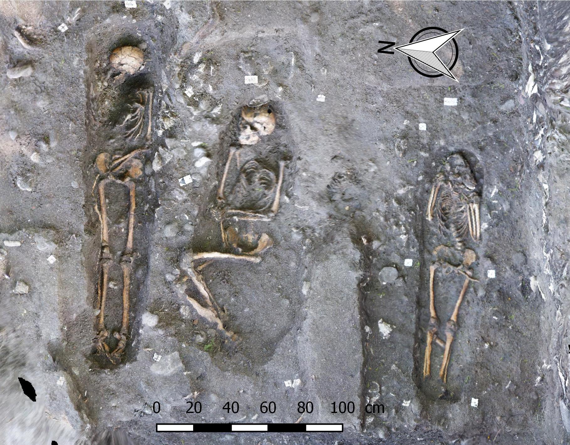 Les sépultures 53, 48 et 51 (de gauche à droite) découvertes à l'Anse Bellay. L'individu de la sépulture 51 présente des incisives supérieures taillées en pointes, pratique initiatique africaine.