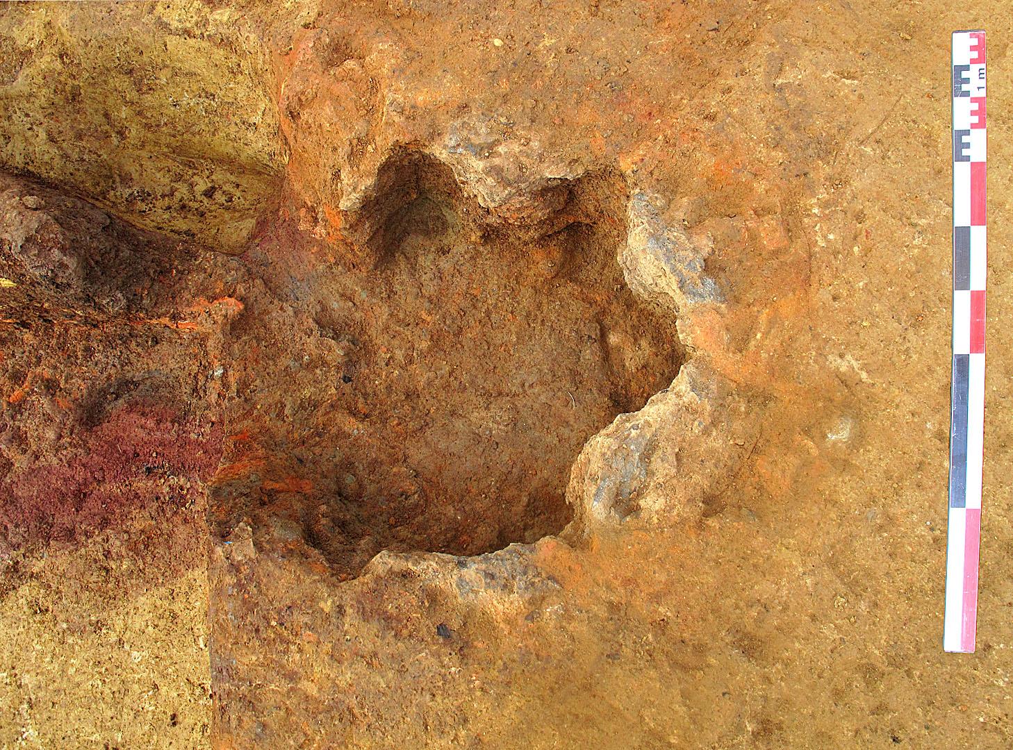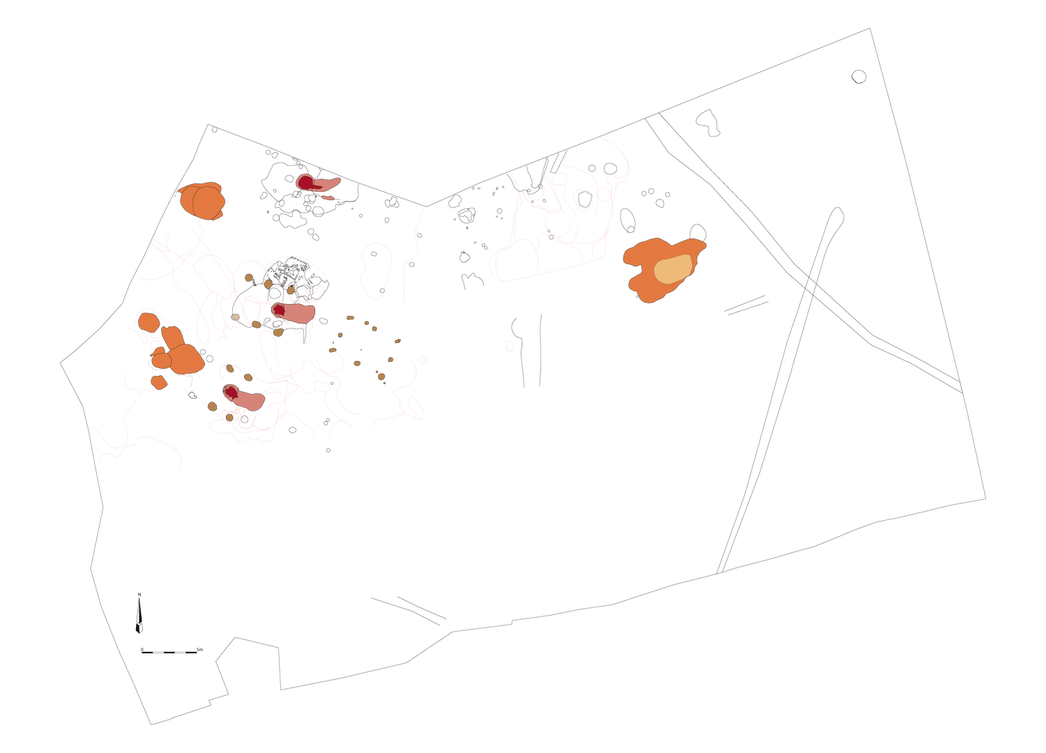 Les grandes fosses qui ponctuent la périphérie de l'espace de travail résultent sans doute de l'extraction d'argile, nécessaire à la construction des fours. Elles ont été comblées, dans un second temps, par les déchets métallurgiques.