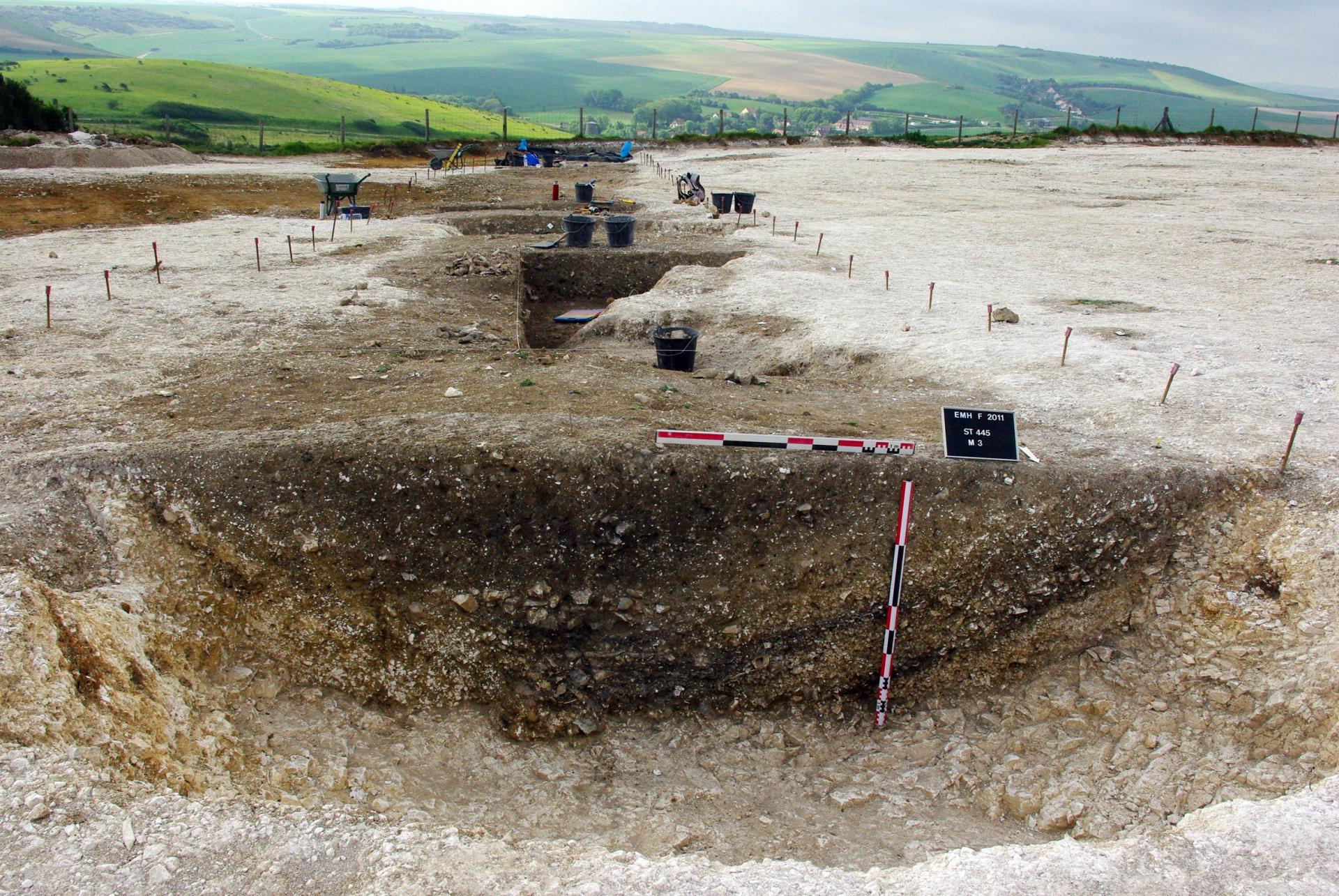 Là où le Mont s'élargit vers l'ouest, un imposant fossé du Néolithique moyen a été découvert par les archéologues. Il enserre un large espace, limité, à l'ouest, par le versant le plus abrupt de l'éperon crayeux. Son tracé, sur 120 mètres de long jusqu'aux limites de l'emprise de la fouille, est assez rectiligne. Au-delà, son parcours demeure inconnu. Quatre segments principaux le constituent, d'une largeur moyenne de 3,50 mètres et d'une profondeur qui peut atteindre jusqu'à 1,60 mètre.