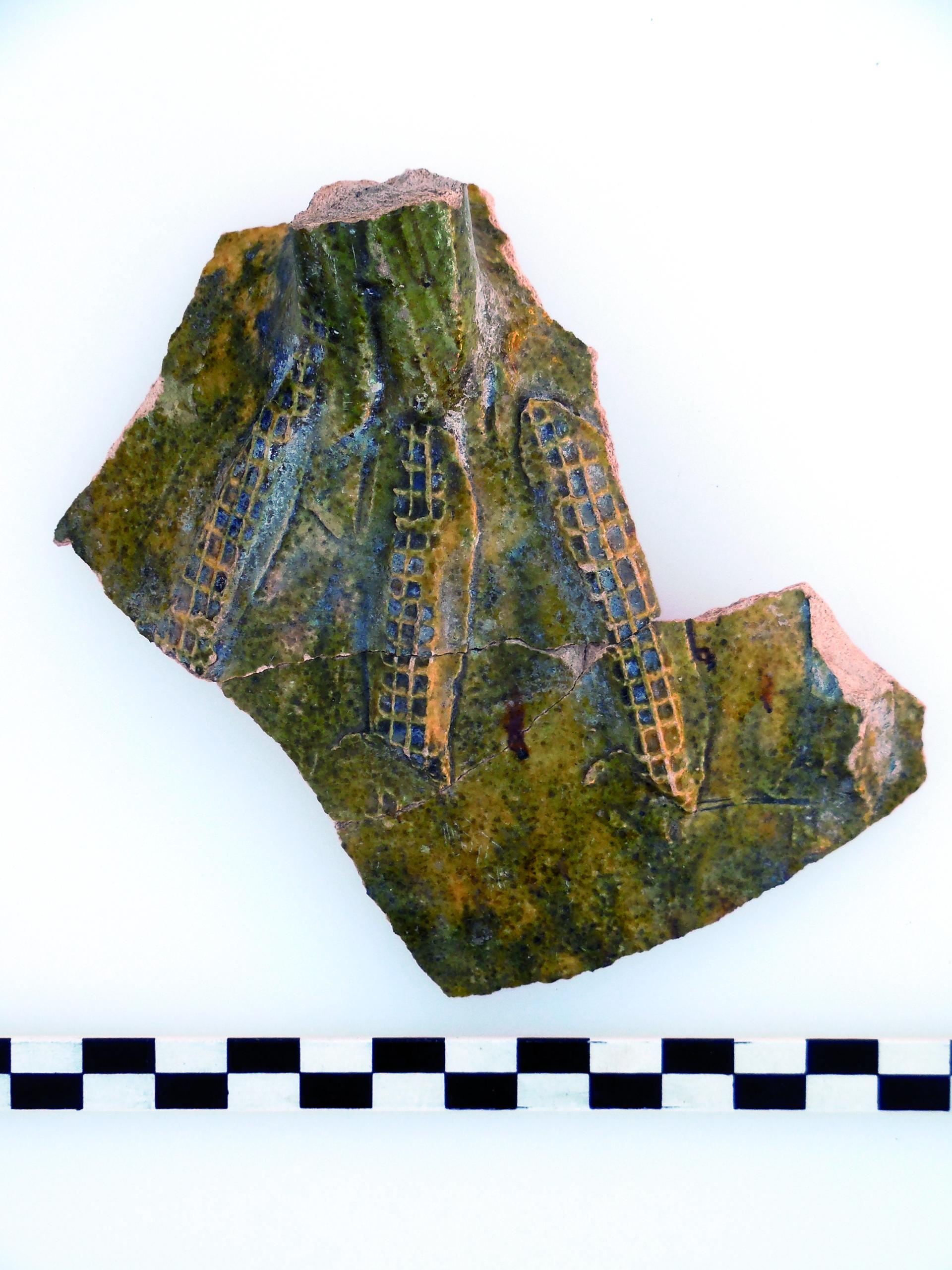 Céramique médiévale : fragments d’un pichet décoré de bandes appliquées et de glaçure verte, XIVe siècle