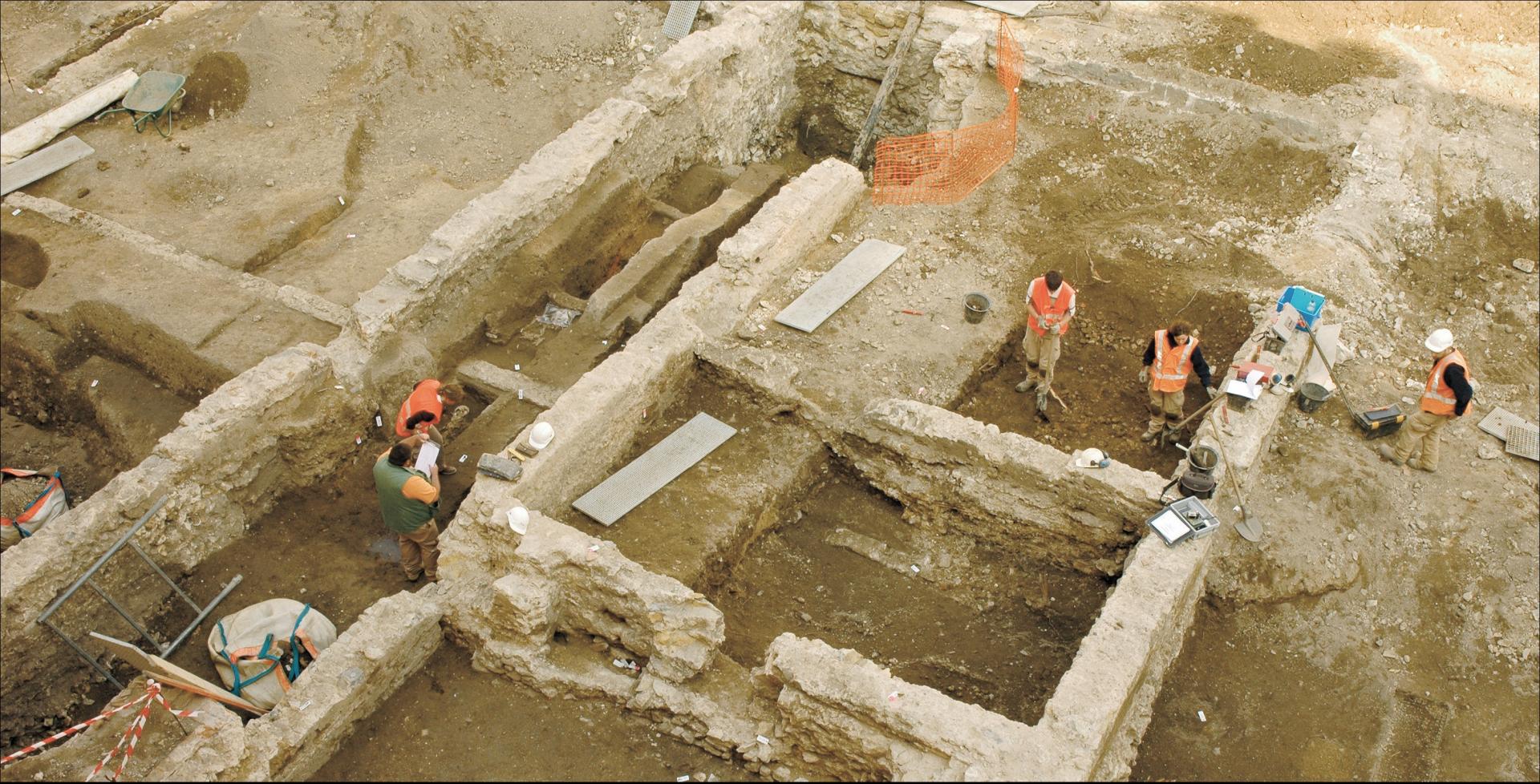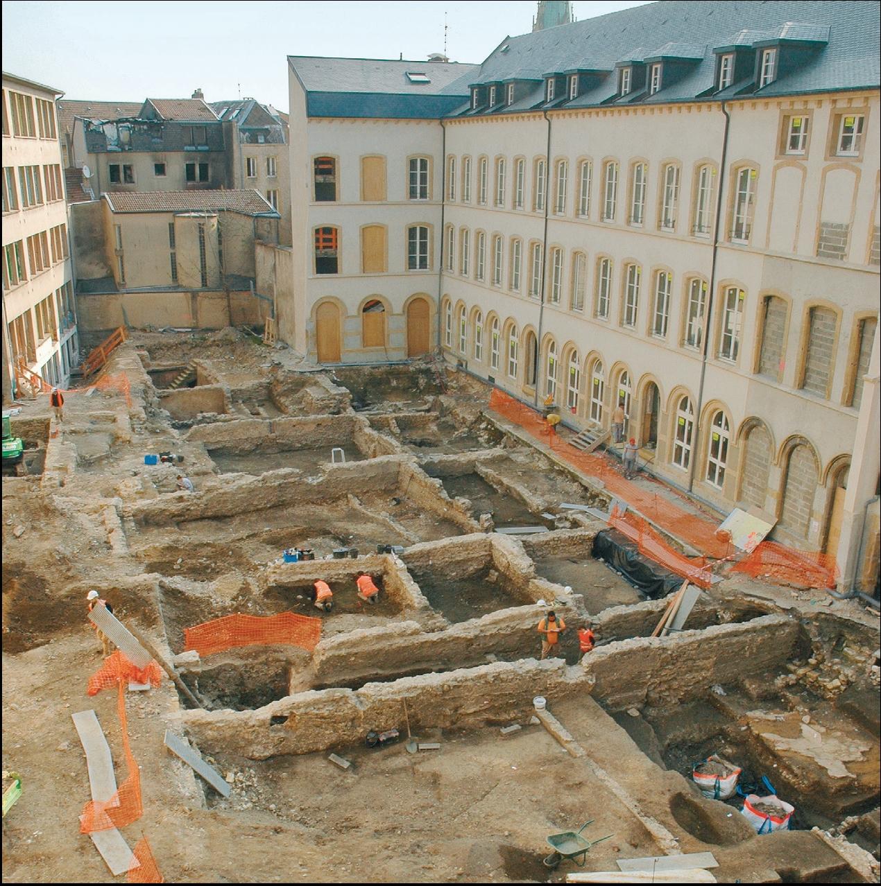 À Metz, les sources archéologiques s'avèrent relativement indigentes pour la longue période qui s'étend du IVe au XIe siècle. Un des enjeux de cette fouille est de comprendre l'évolution du quartier entre la fin de l'Antiquité et le début du Moyen Âge. Actuellement, les données recueillies donnent une image de la ville différente de celle que laissent apparaitre les sources historiques, c'est-à-dire d'une ville importante du point de vue politique, religieux, économique et social. Souvent interprétées a priori et peut-être à tort comme un signe d'abandon ou de crise de la ville, les couches dites de « terres noires » sont l'objet d'une attention particulière de la part d es archéologues des agglomérations d'Europe de l'Ouest (notamment à Tours, Paris, Bruxelles et Londres). Peu spectaculaires et difficiles à fouiller, elles s'avèrent problématiques car elles constituent la principale preuve archéologique du fait urbain pour cette période charnière. C'est pourquoi, en plus de fouilles minutieuses, les sciences de la terre (géoarchéologie, micromorphologie...) et de l'environnement (palynologie...) sont mises à contribution.