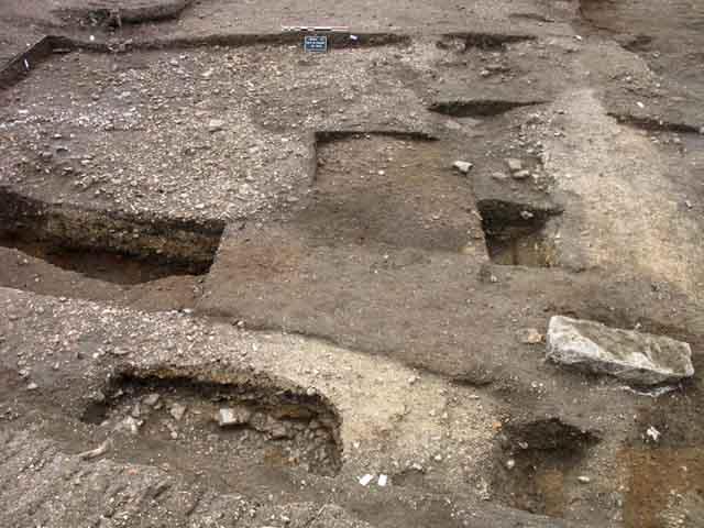 Les deux rues perpendiculaires sont construites avec des graviers et du sable extraits sur place. L'une d'elles, orientée est-ouest et nommée decumanus, et dont la découverte était totalement inattendue, a été dégagée sur une longueur de <?XML:NAMESPACE PREFIX = ST1 />80 m. Large de 6 m, elle est dotée d'un caniveau en bois et d'un trottoir. L'autre rue, orientée nord-sud appelée cardo, n'a été repérée que sur une largeur de 11 m. Elle possède les mêmes caractéristiques que la précédente. Ce segment pourrait correspondre au tracé de l'axe principal nord-sud de la cité : le cardo maximus.