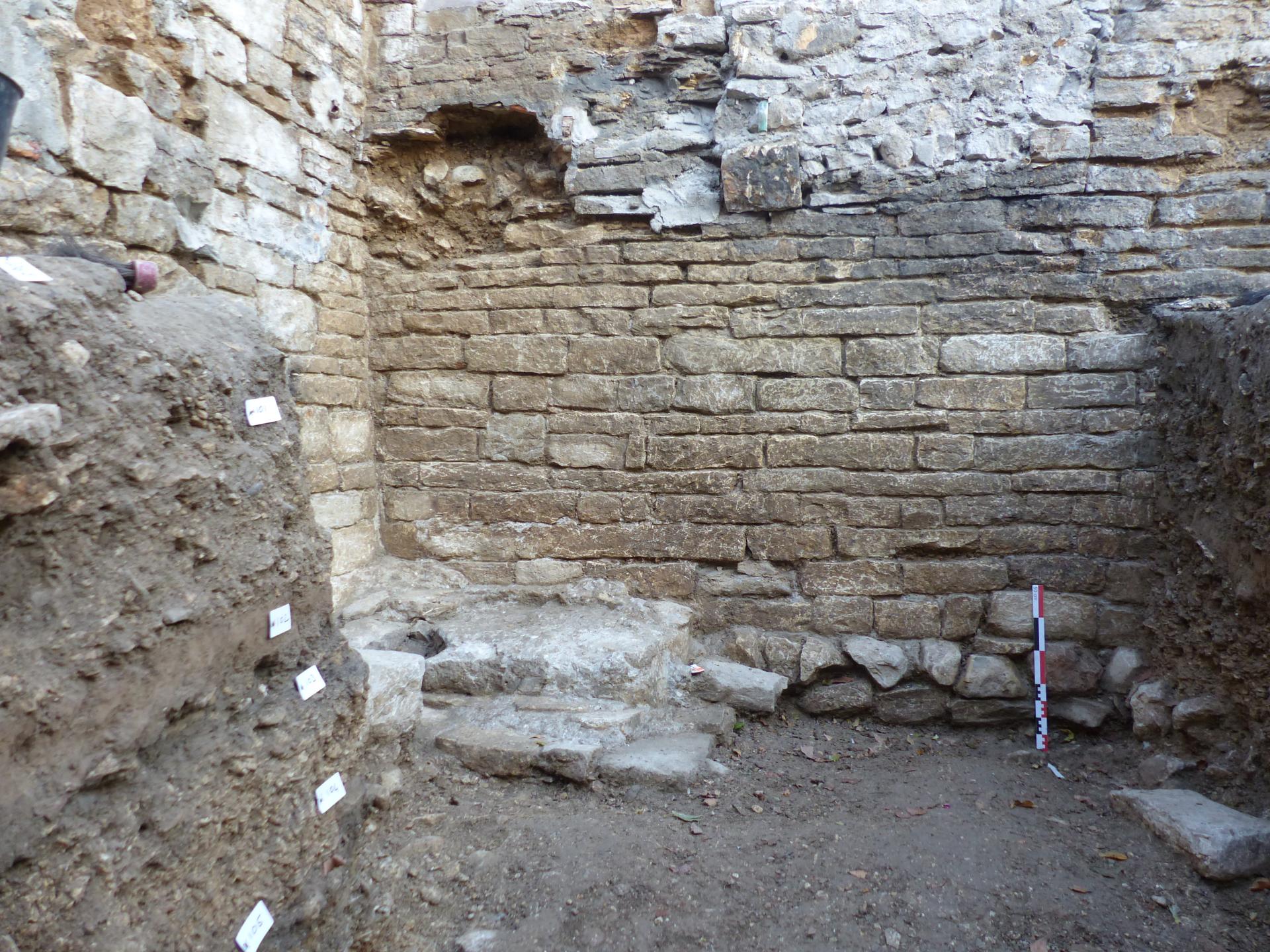Les élévations de belle facture qui ont été mises en évidence lors d’un diagnostic dans des caves toutes proches, dont un arc sur le mur occidental, permettent de restituer un niveau de circulation à corréler avec le seuil médiéval du portail de l’abbatiale.
