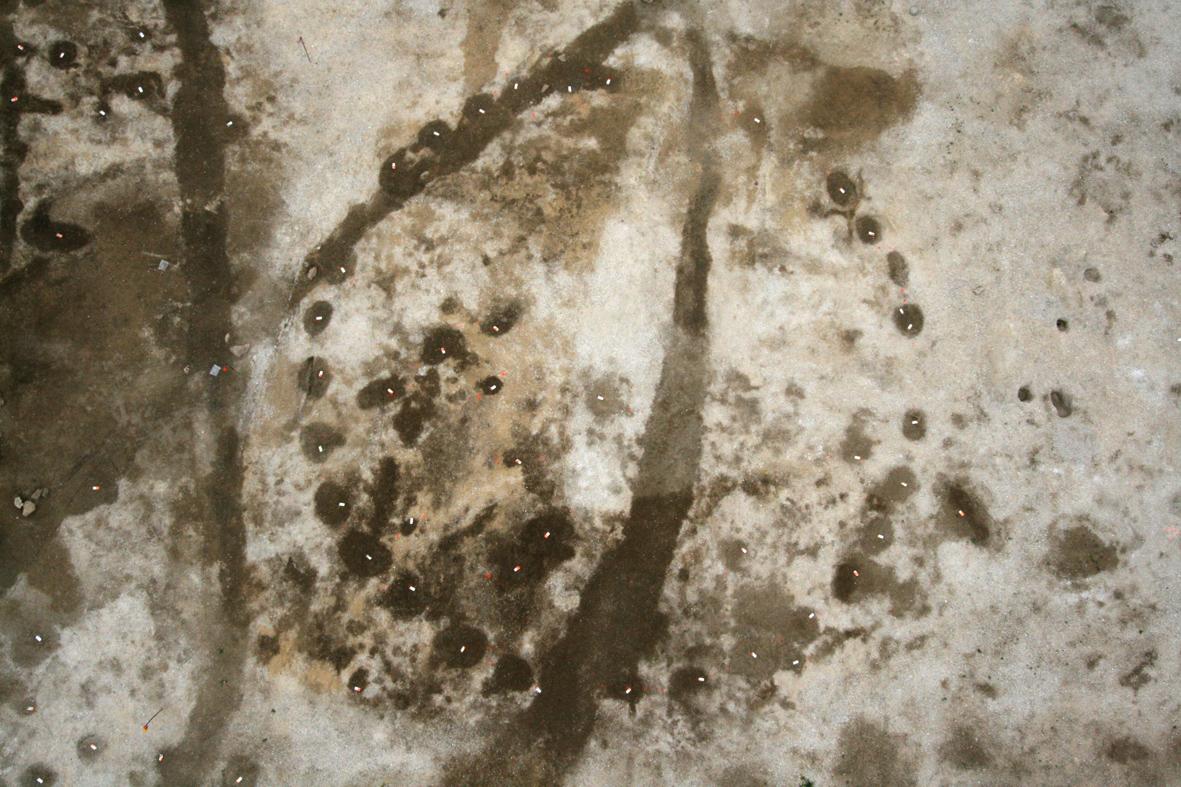 Vue aérienne des deux bâtiments monumentaux (300 m2 et 900 m2) dans leur enclos. Sur la droite, la trace laissée dans le sol par le premier enclos est également très lisible.