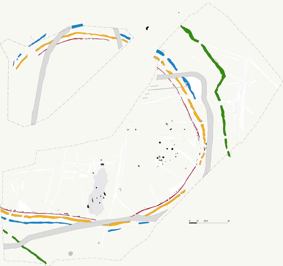 L'étendue et l'ancrage marqué de cette installation ont impliqué une somme de travail considérable et indiquent un projet respecté sur le long terme. Les recreusements, propres à certains segments de fossés, et autres aménagements observés témoignent d'une histoire complexe ; mais l'absence de recoupement entre les séries de fossés et de palissades, tout comme les interruptions, attestent un fonctionnement au moins partiellement contemporain de ces structures. Une grande quantité de mobilier - essentiellement lithique et céramique - a été retrouvée dans ces fossés. On distingue des zones de rejets (avec un mobilier très fragmenté, dans les parties supérieures des fossés), et des zones de dépôts (avec un mobilier "mis en scène", au fond des fossés : des céramiques souvent entières, parfois déposées à l'envers ).
