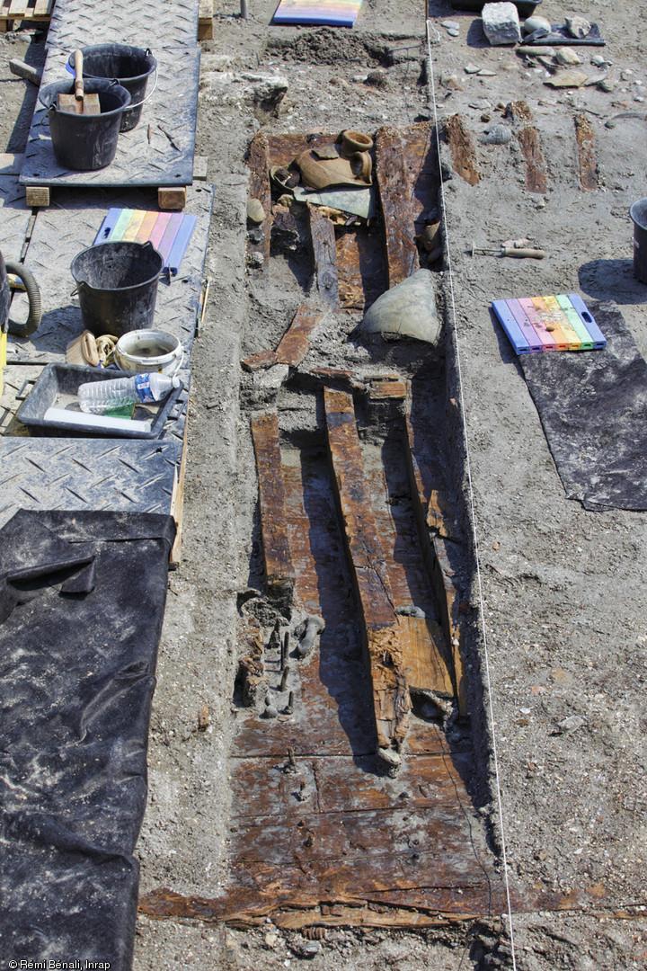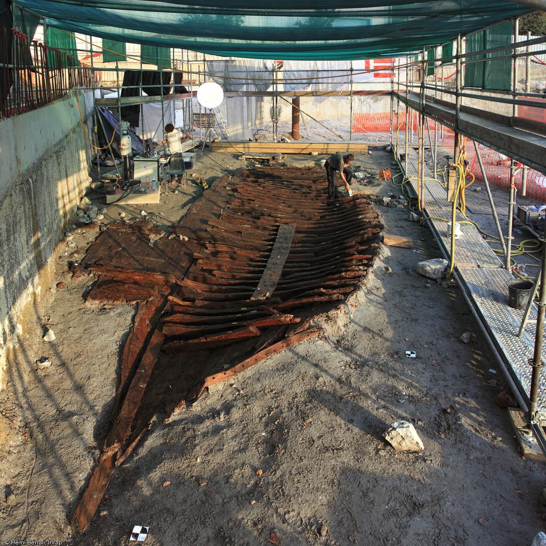 Dans la dernière zone explorée par les archéologues de l'Inrap, l'épave d'un navire romain a été découverte. Conservé sur plus de 15 m de long, le bateau est couché sur le flanc dans un endroit peu profond (à moins de 1,60 m sous le niveau marin antique). Dans le cadre d'une coopération avec le Centre Camille Jullian, l'Inrap a associé à l'analyse et l'interprétation de cette découverte, une archéologue du CNRS, spécialiste de l'archéologie navale.