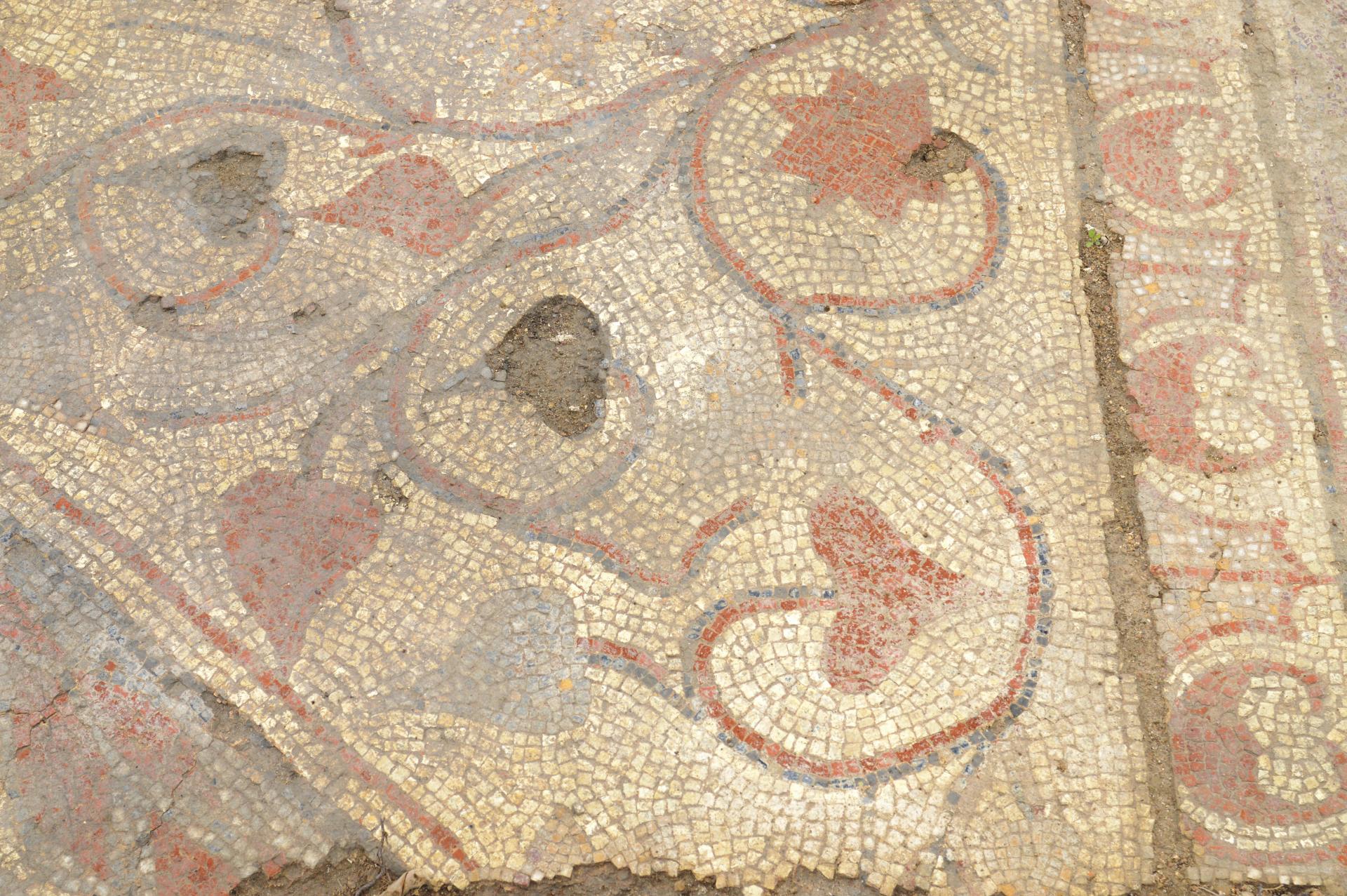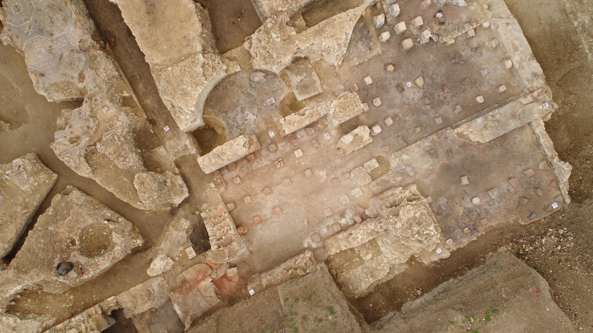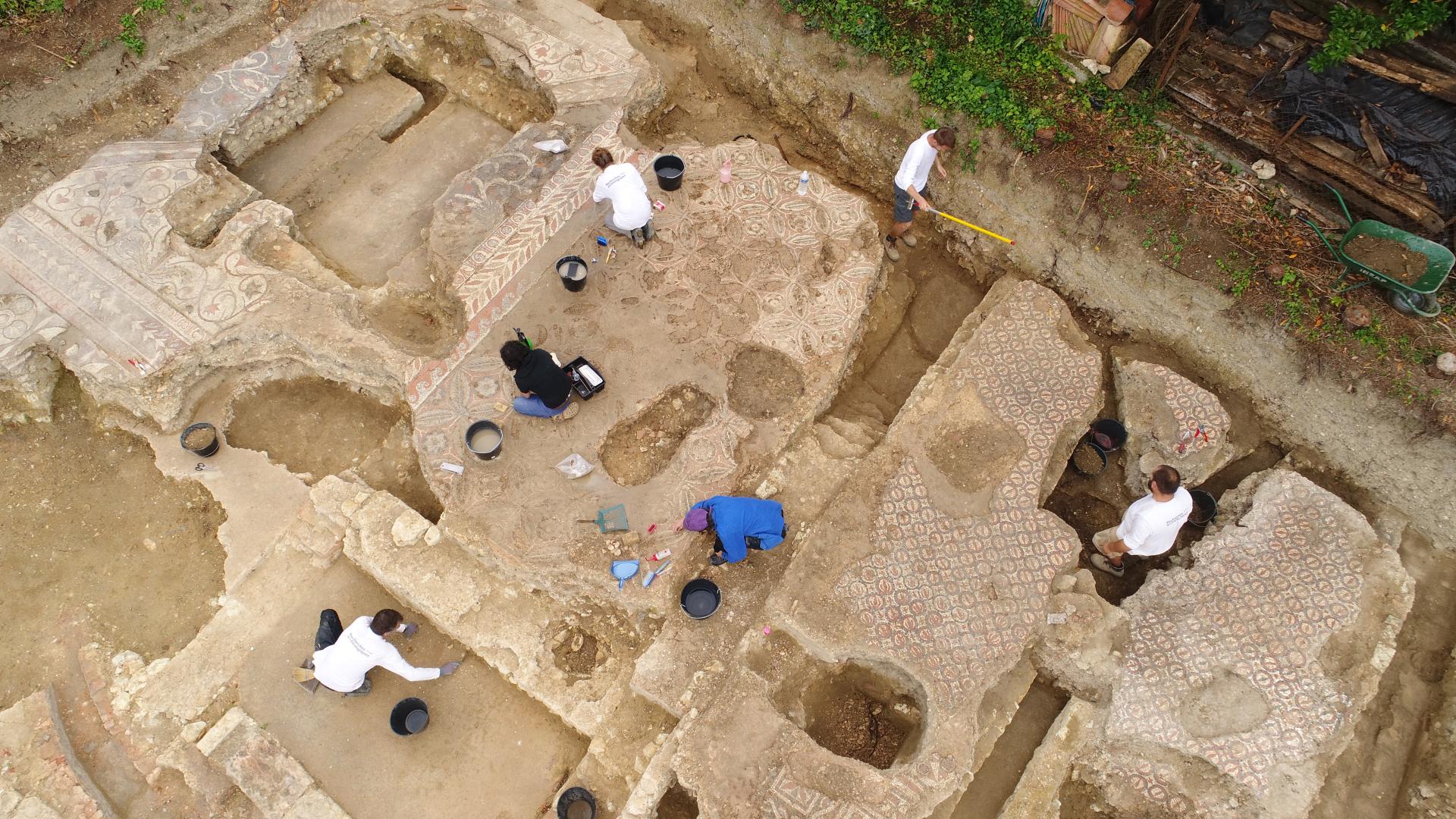 Peu après les années 320-330 de notre ère, cette domus, est dotée d’un ensemble thermal. Les vestiges actuellement mis au jour s’inscrivent dans un corps de bâtiment, long de 28 m et large de 10 m. Au moins trois pièces chauffées par le sol (ce que les archéologues appellent les hypocaustes rayonnants), sont agrémentées de mosaïques polychromes différentes. Deux d’entre elles présentent des motifs géométriques, composés d’octogones et de carrés pour l’une, de « cocardes » pour l’autre. Plus vaste, la troisième est un tapis de figures géométriques et florales complexes. Sont aussi présentes des mosaïques murales, attestées par des tesselles de pâte de verre noir bleuté, vert ou rouge, dont les fragments ont été retrouvés dans les gravats antiques scellant les sols.
