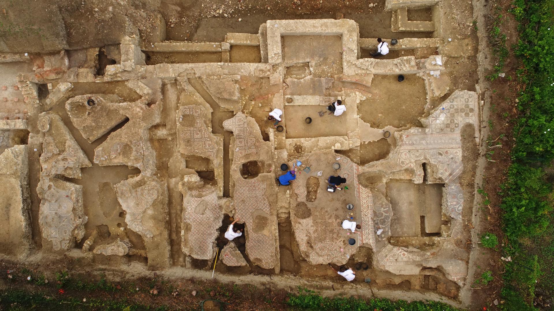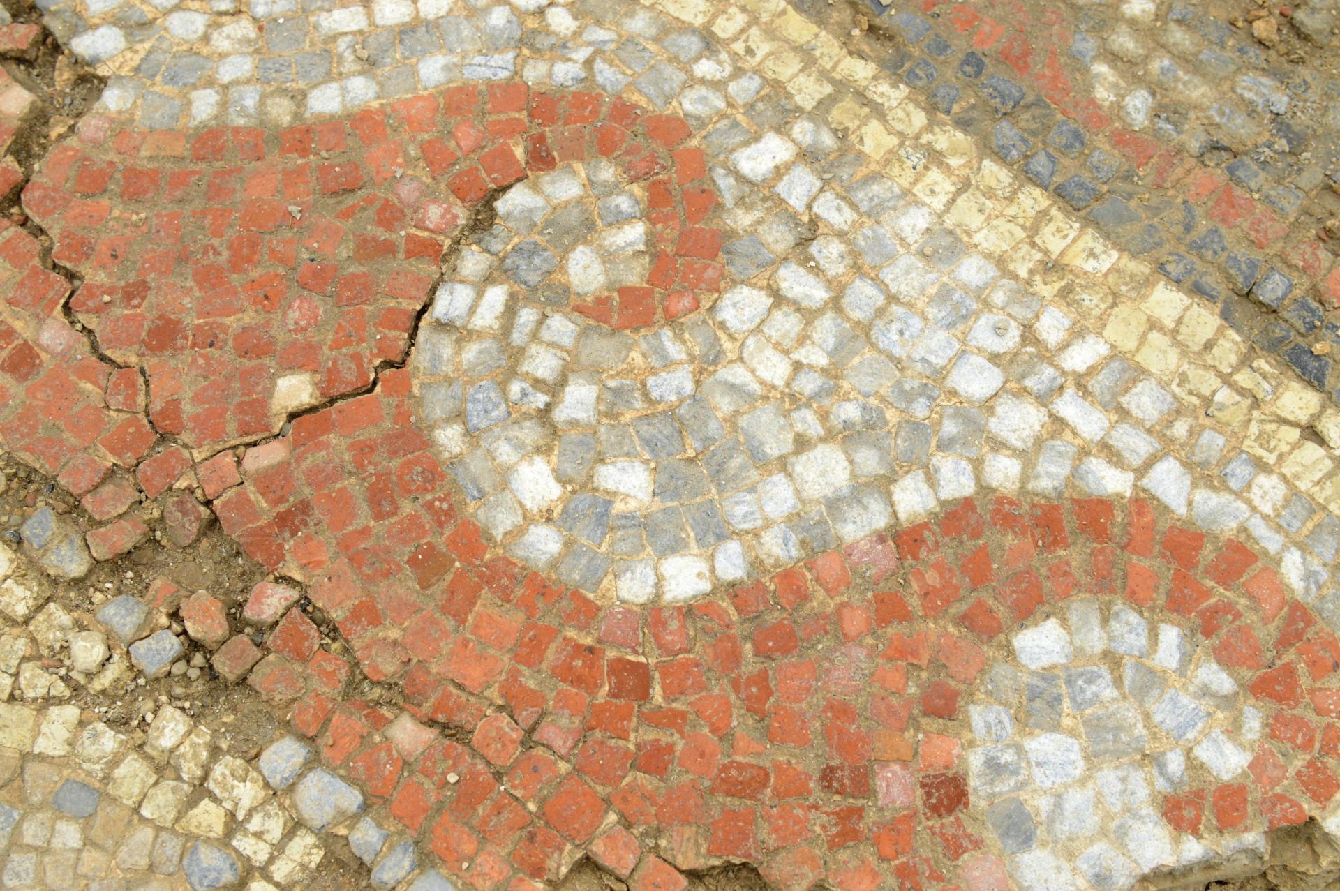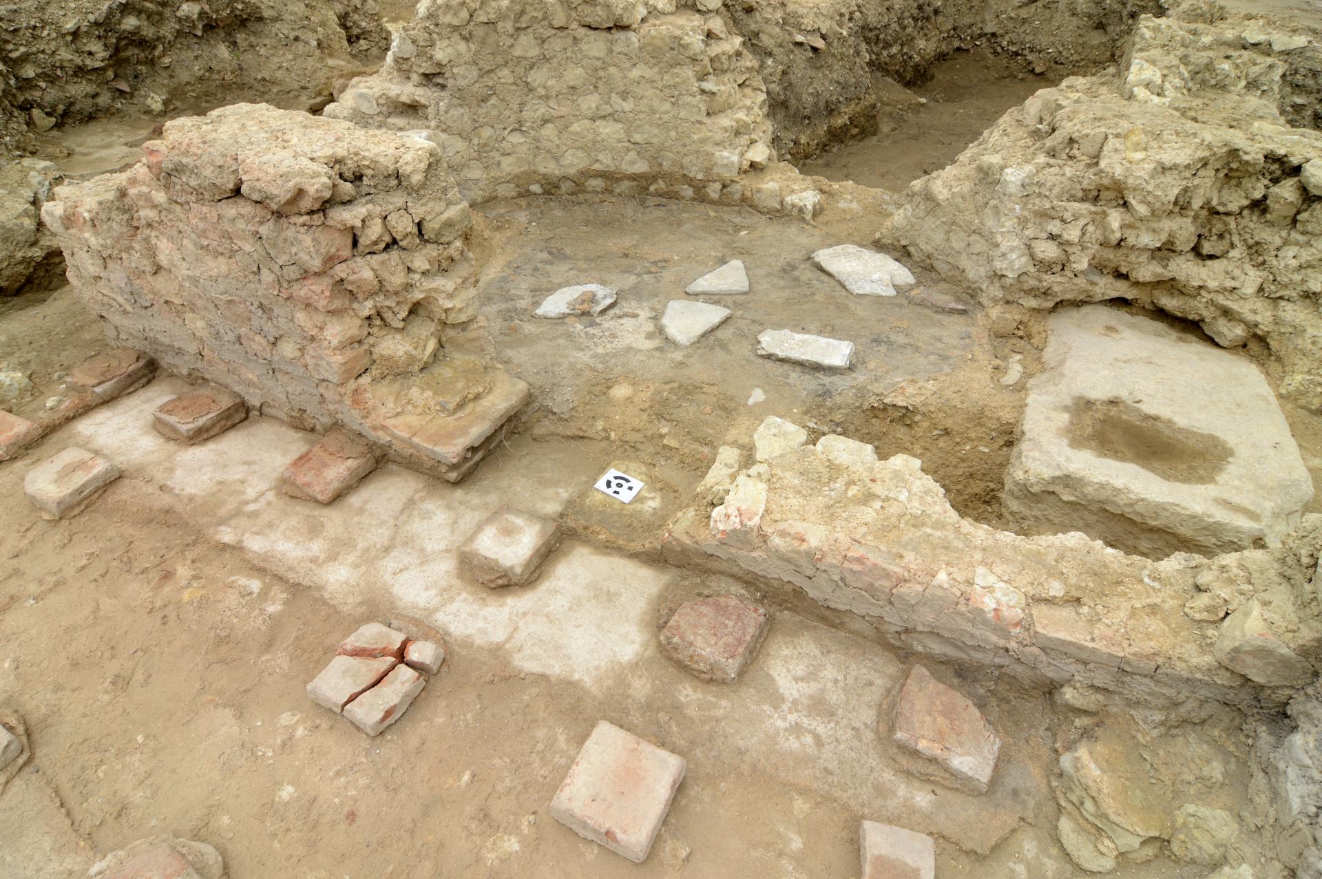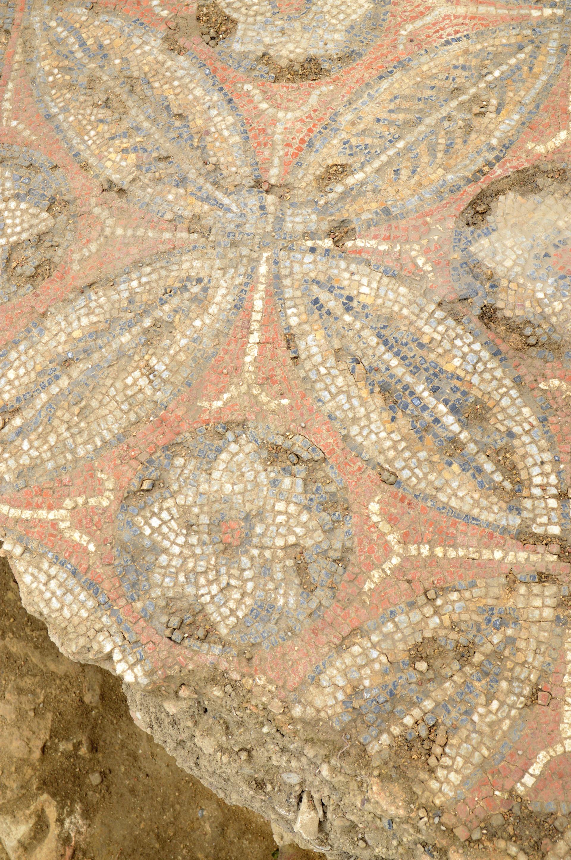 Peu après les années 320-330 de notre ère, cette domus, est dotée d’un ensemble thermal. Les vestiges actuellement mis au jour s’inscrivent dans un corps de bâtiment, long de 28 m et large de 10 m. Au moins trois pièces chauffées par le sol (ce que les archéologues appellent les hypocaustes rayonnants), sont agrémentées de mosaïques polychromes différentes. Deux d’entre elles présentent des motifs géométriques, composés d’octogones et de carrés pour l’une, de « cocardes » pour l’autre. Plus vaste, la troisième est un tapis de figures géométriques et florales complexes. Sont aussi présentes des mosaïques murales, attestées par des tesselles de pâte de verre noir bleuté, vert ou rouge, dont les fragments ont été retrouvés dans les gravats antiques scellant les sols.