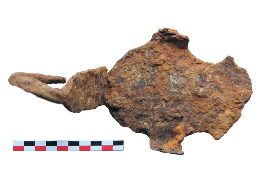 Il faut enfin signaler une clochette en bronze, probablement issue d’une série fixée en guirlande à un élément du harnachement.