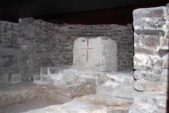 Au cours des VIIe et VIIIe siècle, des tombes sous lauses se sont installées à l'extérieur du sanctuaire. Une abside semi-circulaire a ensuite été reconstruite au IXe ou Xe siècle sur les bases du chevet antérieur. Elle est conservée sur plus de deux mètres de hauteur et entoure une exceptionnelle base d'autel maçonnée. Le chevet carolingien, plusieurs fois voué à disparaître, a finalement été conservé au centre de la crypte du XIe siècle, sous le sol des églises romanes, avant d'être noyé sous deux mètres de remblais modernes fouillés ces dernières années.
