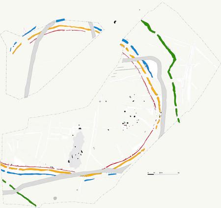 Sachant qu'aucun recoupement stratigraphique n'existe entre les séries de fossés, la recherche de traces de réaménagement ou de modifications de tracé initial (création d'un passage là où le fossé initial était continu par exemple), ainsi que les symétries/dissymétries entre fossés ont fait l'objet d'une attention particulière. De même un grand nombre de coupes a été réalisé afin d'enregistrer le mode de remplissage des fossés.